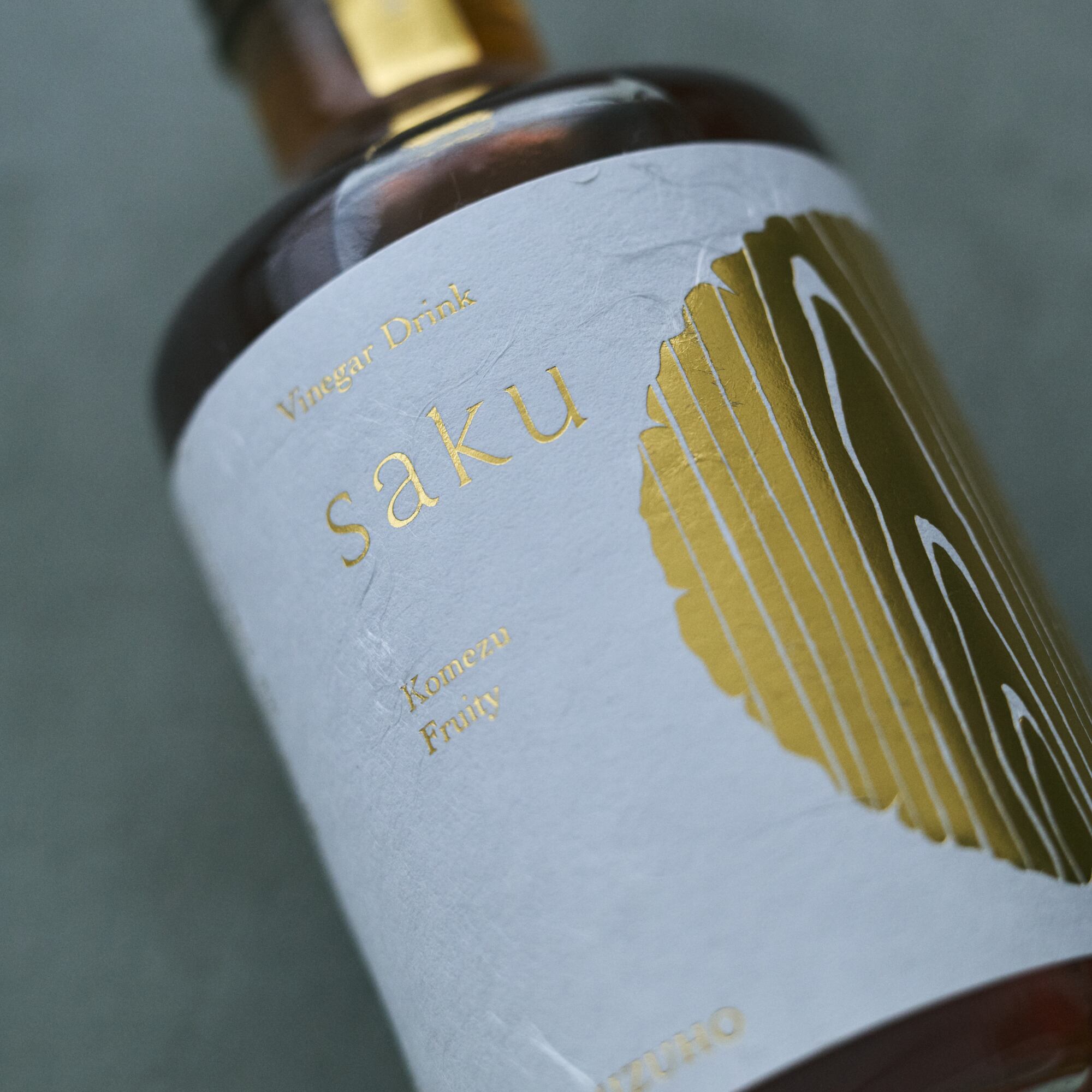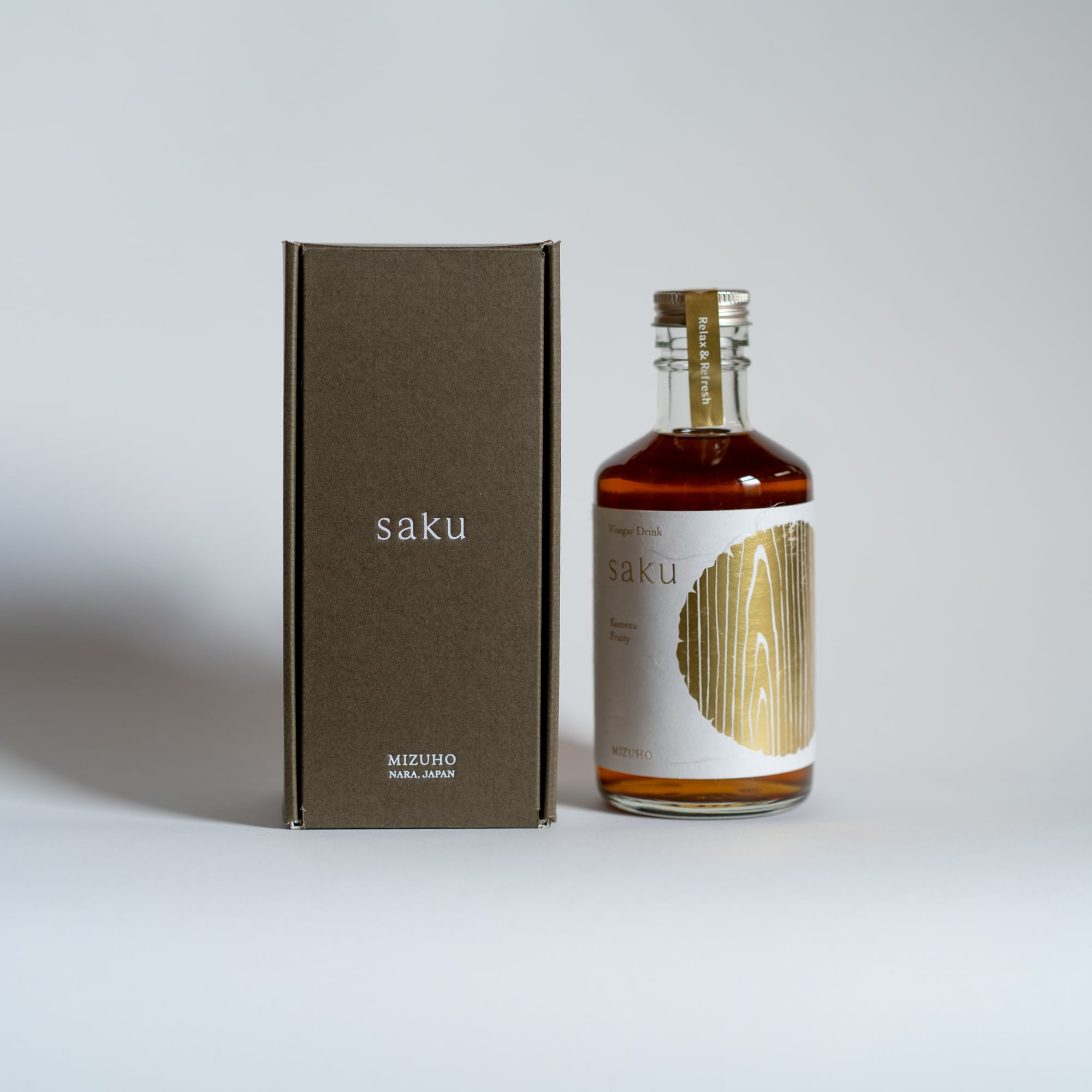 saku[komezu fruity] は、木桶仕込みの純米酢にフルーツやハーブをブレンドした、ノンアルコールのビネガードリンク(希釈タイプ) です。